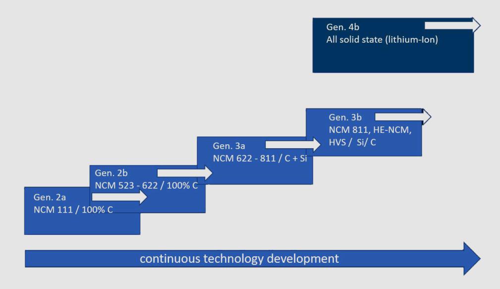 2030年發(fā)展路線圖主要考慮基于改性鎳鈷錳氧化物(NMC)材料的鋰基技術,從NMC 111到NMC 811,使鎳含量增加,鈷含量降低,還有碳/硅復合材料的高電容負極材料的應用。固態(tài)技術也將有針對性地提高能量密度和安全性。