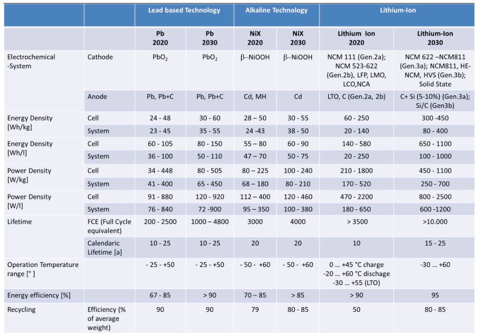 歐洲主流電池技術包括鉛、鋰和鎳基電池;鈉技術也有改進的潛力,研發(fā)重點是通過設計改進提高充電能力和延長循環(huán)壽命。不過,這類技術涵蓋范圍較小,不做詳細評價。