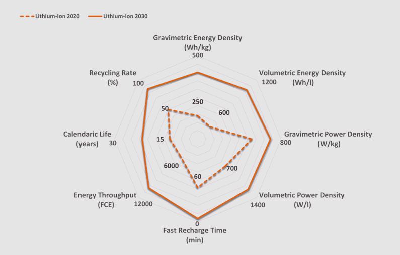 鋰離子(Li-ion)是汽車和工業(yè)應用的領先技術,到2030年仍將如此,目前已成為不同應用批量生產和部署的標準電池。對更高能量密度的主要要求是實現(xiàn)更長行駛里程,這與電子交通直接相關。