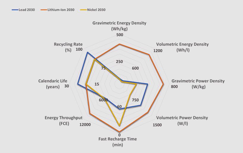 2030年每種電池技術的目標關鍵性能指標則展示了市場上技術互補性的延續(xù)。