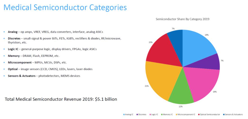 據(jù)市場(chǎng)研究機(jī)構(gòu)Omida估算,2020年疫情引發(fā)呼吸機(jī)及醫(yī)療影像設(shè)備銷售大漲,因此帶動(dòng)了相關(guān)電子元器件的銷售,使得2020年醫(yī)療半導(dǎo)體相比2019年增長(zhǎng)近10%,但2021年這種增長(zhǎng)勢(shì)頭恐不能持續(xù)。不過醫(yī)療半導(dǎo)體長(zhǎng)期勢(shì)頭看好,主要理由如下:遠(yuǎn)程醫(yī)療健康應(yīng)用的快速發(fā)展;設(shè)備更替——新設(shè)備的半導(dǎo)體用量都遠(yuǎn)超舊設(shè)備;人工智能在醫(yī)療與健康領(lǐng)域的增長(zhǎng);便攜式與可穿戴醫(yī)療健康設(shè)備的增長(zhǎng);以及個(gè)人健康設(shè)備中醫(yī)護(hù)功能的增加。