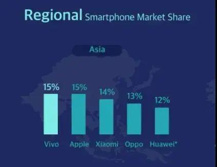 報告顯示,在亞洲市場,vivo 的市場占有率達到 15%,與蘋果公司并列第一。小米公司、OPPO 以及華為排在三至五位,市場占有率分別為 14%、13%、12%。華為的數(shù)據(jù)包含了榮耀智能機出貨量。