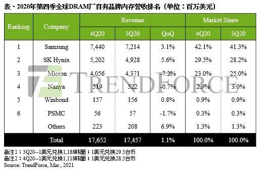 3月7日消息,TrendForce集邦咨詢本月發(fā)布了 2020 第四季度 DRAM 市場報告。報告顯示,該季度DRAM總產(chǎn)值達 176.5 億美元,季增 1.1%。整體市況歸因于2020年第三季下旬華為被列入出口限制清單,使中國智能手機品牌 Oppo、Vivo、小米積極加大零部件采購力度,因而帶動第四季各家DRAM供應(yīng)商出貨表現(xiàn)。