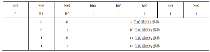 DS18B20內(nèi)部存儲(chǔ)資源由高速暫存器和EEPROM構(gòu)成,如圖6-22所示。其中,暫存器的第4個(gè)字節(jié)是配置寄存器(見(jiàn)表6-4),其第6位和第5位用于設(shè)置溫度傳感器的位數(shù)(即分辨率)。