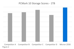 在我們的實驗室測試中,美光 2550 SSD 的 PCMark 10 存儲性能基準得分始終高于競品[]。與競品相比,美光 2550 SSD 512GB 和 1TB版本的 PCMark 10 存儲性能得分,分別如圖 1 和圖 2 所示。