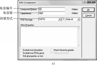 雙擊元器件后可以打開“Edit Component”(元器件編輯)對話框,并在其中設(shè)置元器件的參數(shù),如電容的編號、電容值和封裝形式等,如圖9-6c所示。