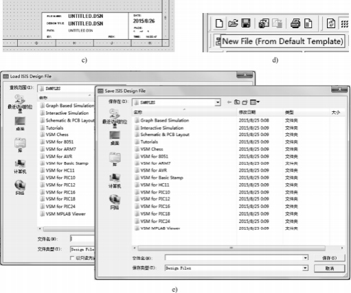 c)圖樣模板上的設(shè)計(jì)信息d)新建設(shè)計(jì)的快捷菜單e)“Load ISIS Design File”和“Save ISIS Design File”對話框