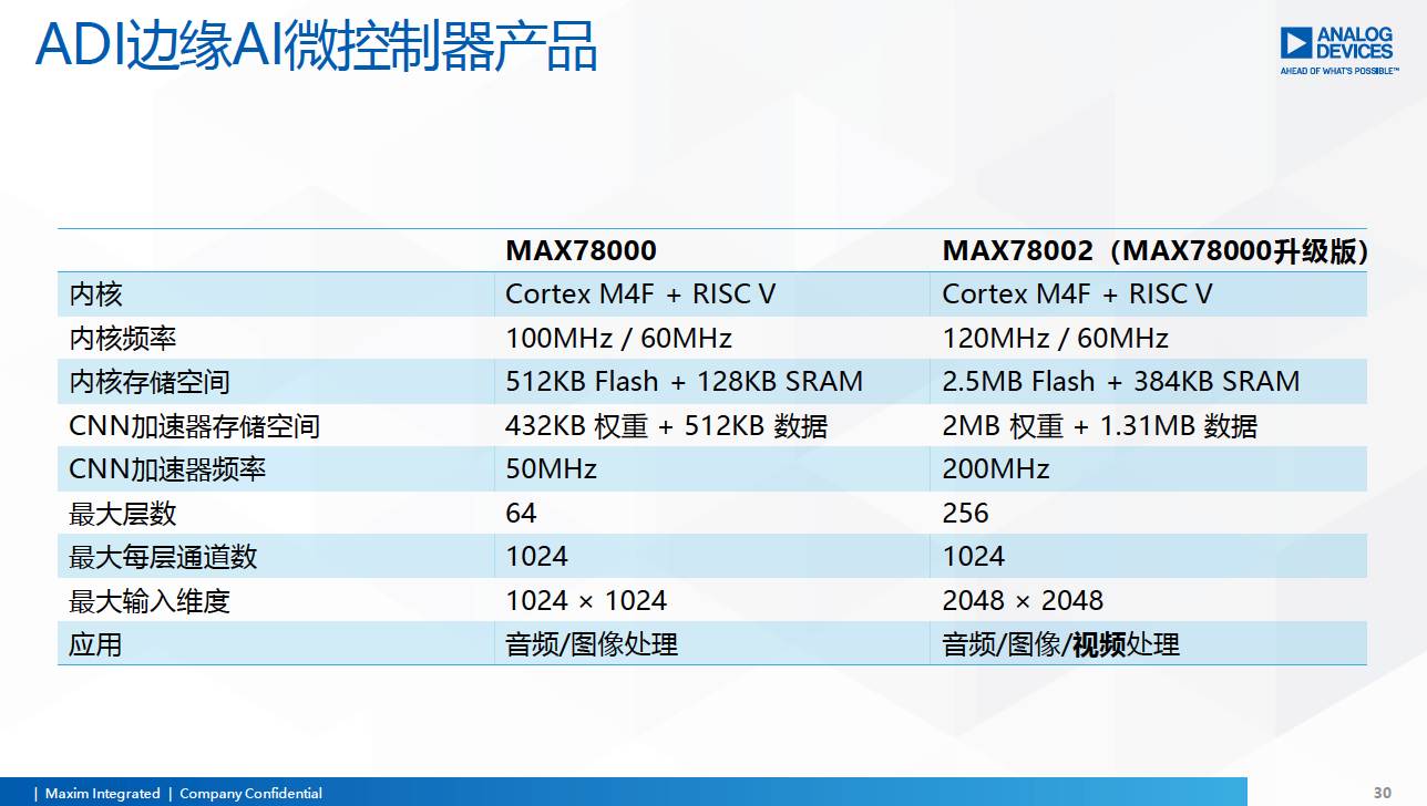 在百億IoT設(shè)備中,大部分的計(jì)算單元是MCU。而在MCU中集成CNN加速器,已經(jīng)成為了MCU的一個(gè)發(fā)展方向。目前諸多MCU廠商都已經(jīng)推出了AI集成的MCU產(chǎn)品,其中也包括ADI的邊緣AI微控制器產(chǎn)品MAX7800X系列,目前該系列產(chǎn)品型號(hào)包括MAX78000和MAX78002。