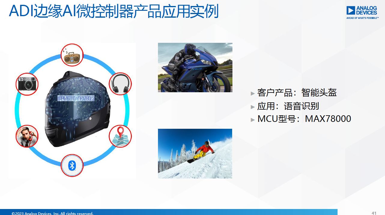 目前MAX78000支持的模型已經(jīng)有一些客戶成功案例,比如用來做山火監(jiān)測(cè)的安全攝像頭,有些地方經(jīng)常突發(fā)山火,需要一些遠(yuǎn)程監(jiān)控設(shè)備,但又不需要傳輸大量的圖像。另外比如城市里的管道漏水、漏氣,是通過聲音和管道震動(dòng)來檢測(cè)的。還有一些特殊產(chǎn)品,比如摩托車頭盔上的攝像頭,需要采用語音控制等等。其實(shí)ADI已經(jīng)無形中將AI應(yīng)用到方方面面。