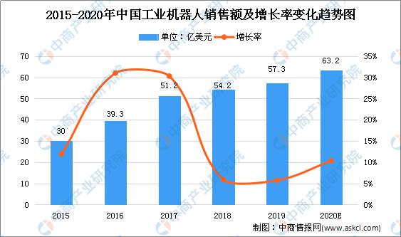 圖:2015-2020年中國工業(yè)機(jī)器人銷售額及增長率變化趨勢