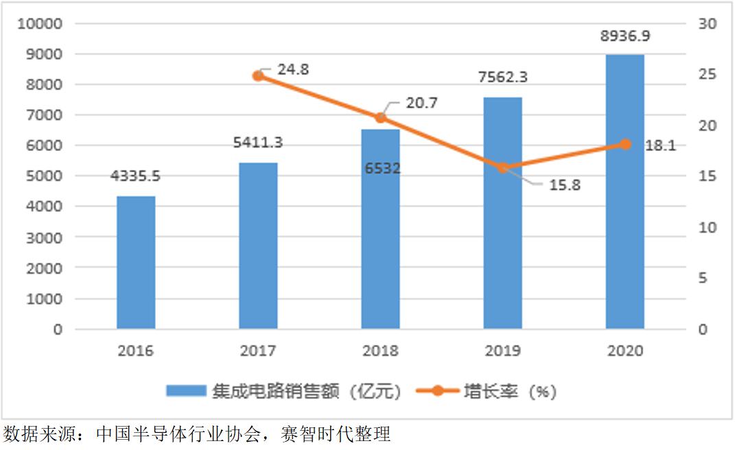 近年來(lái),我國(guó)集成電路行業(yè)遭遇“卡脖子”問(wèn)題,發(fā)展受到一定沖擊。2020年,受到疫情影響,終端產(chǎn)品和醫(yī)療電子領(lǐng)域市場(chǎng)需求急劇增加,在國(guó)家政策支持下,我國(guó)集成電路行業(yè)逆勢(shì)增長(zhǎng)。根據(jù)賽智時(shí)代整理的數(shù)據(jù)顯示,2020年我國(guó)集成電路銷售額達(dá)到8936.9億元,相較于2019年同比增長(zhǎng)18.1%。