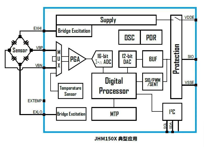 第二款芯片JHM150X做到了技術(shù)領(lǐng)先,是帶SENT協(xié)議的,是針對惠斯通電橋式傳感器信號設(shè)計的具有數(shù)字補償算法高精度信號調(diào)理電路,可對傳感器信號的偏移、靈敏度、溫漂和非線性同時進行補償。補償算法的校準(zhǔn)系數(shù)保存在片上的MTP中。