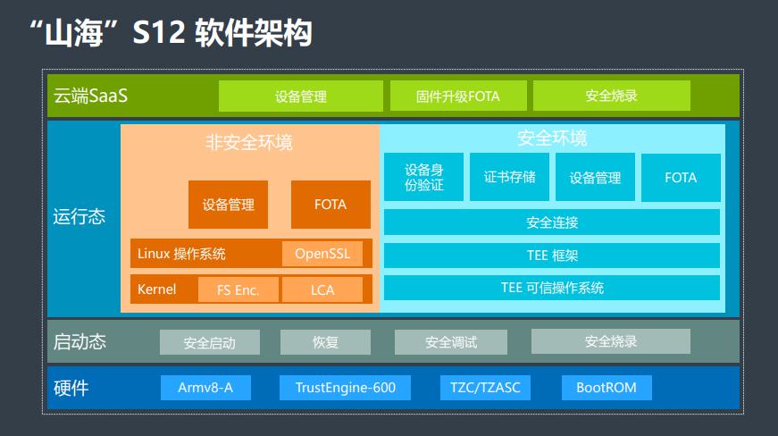 “山?!盨12提供豐富的固件和軟件。在啟動態(tài)提供安全啟動、恢復、安全調試和安全燒錄的固件,保障客戶產品啟動狀態(tài)安全?!吧胶!盨12運行態(tài)分為安全環(huán)境和非安全環(huán)境。在安全環(huán)境中,“山海”S12提供可商用的TEE操作系統(tǒng),支持TrustZone技術?;赥EE操作系統(tǒng),S12還提供了固件的在線升級(FOTA)、安全連接、設備身份識別、安全證書存儲等。在非安全環(huán)境下“山海”S12也會提供豐富的固件,包括文件加解密系統(tǒng)以及對Linux系統(tǒng)安全的增強。