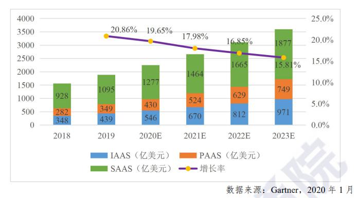 全球云計(jì)算市場(chǎng)保持穩(wěn)定增長(zhǎng)態(tài)勢(shì),據(jù)Gartner數(shù)據(jù)顯示,2019年,以IaaS、PaaS和SaaS為代表的全球云計(jì)算市場(chǎng)規(guī)模達(dá)到 1883 億美元,增速 20.86%。預(yù)計(jì)未來(lái)幾年市場(chǎng)平均增長(zhǎng)率在18%左右,到2023年市場(chǎng)規(guī)模將超過(guò)3500億美元。