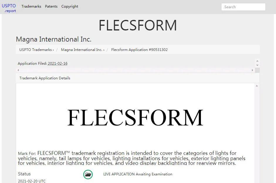 他說的是真的,在美國USPTO.report商標(biāo)專利版權(quán)搜索網(wǎng)站上顯示:FLECSFORM? 商標(biāo)注冊旨在涵蓋車輛用燈的類別,即車輛尾燈、車輛照明裝置、車輛外部照明面板、車輛內(nèi)部照明和后視鏡視頻顯示背光。