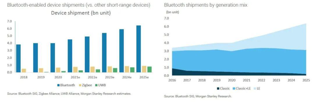摩根士丹利認為,當前來看,遠距離(戶外)無線通信場景下,5G無疑是最佳選擇,預計2021年5G手機滲透率將接近40%;Wi-Fi無疑是中距離通信的王者,預計2024年Wi-Fi 6滲透率將超過80%。雖然遠距離與中距離通信都覆蓋了短距離通信,但摩根士丹利認為,5G和Wi-Fi并不能替代藍牙,三者之間是互補關系。主要原因有三:首先,與5G和Wi-Fi相比藍牙在短距離通信上效率更高,例如藍牙可以實現(xiàn)點對點通信,但5G或Wi-Fi都需要中轉;其次,藍牙在功耗與成本上都優(yōu)于5G和Wi-Fi;最后,藍牙在音頻、定位方面應用生態(tài)豐富,易于實現(xiàn)。