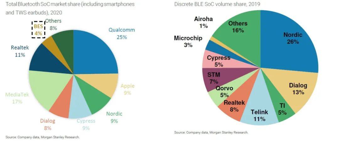 其中,藍牙音頻市場無疑是藍牙芯片增長的最大驅動力。而在一眾廠商中,摩根士丹利最看好恒玄科技的增長潛力:現(xiàn)有營收規(guī)模小,增長空間大;TWS(真無線)藍牙音頻市場天花板還比較高,預計2025年可超過10億美元;與本土對手相比有技術優(yōu)勢,與國外對手相比,有成本及國產(chǎn)優(yōu)勢;產(chǎn)業(yè)鏈本土化需求,將使恒玄科技在產(chǎn)業(yè)物聯(lián)網(wǎng)市場受益;獲得OPPO、阿里及小米的投資,和大客戶建立起長期穩(wěn)定的合作關系。