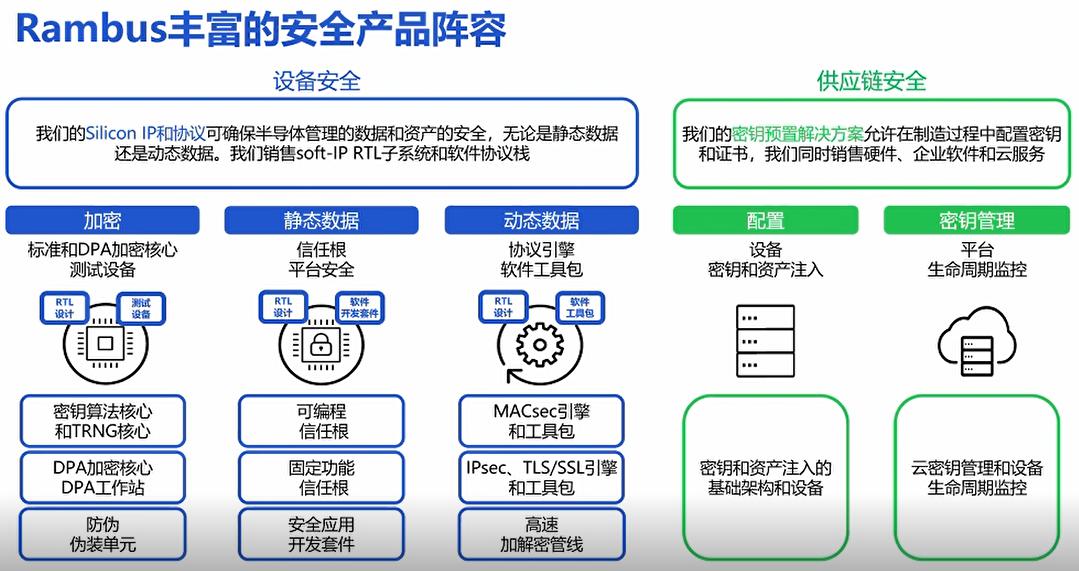 Rambus引領(lǐng)芯片和設(shè)備安全領(lǐng)域長達(dá)二十多年,提供豐富的安全I(xiàn)P產(chǎn)品線,涵蓋半導(dǎo)體設(shè)備安全和供應(yīng)鏈安全兩大方向。其中,信任根產(chǎn)品提供了芯片和設(shè)備安全的基礎(chǔ),基于“硬件不可更改”的安全原則,Rambus信任根產(chǎn)品為網(wǎng)聯(lián)設(shè)備提供了最高級別的安全防護(hù)。