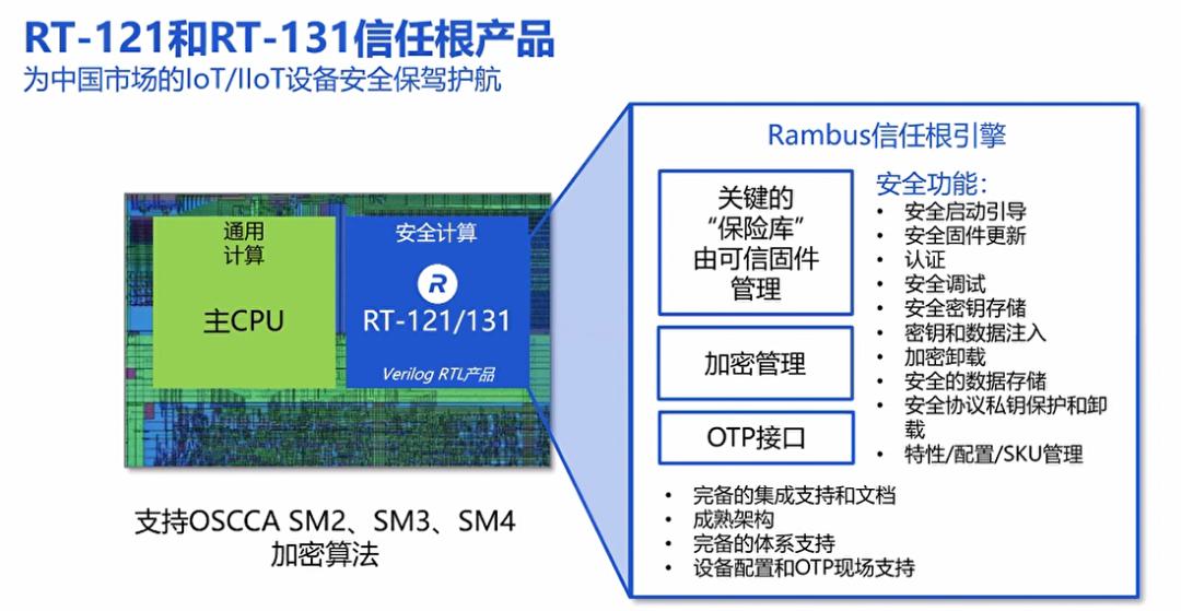 RT-121和RT-131信任根產(chǎn)品專為中國的物聯(lián)網(wǎng)、工業(yè)物聯(lián)網(wǎng)、網(wǎng)關(guān)及邊緣設(shè)備等系統(tǒng)級芯片(SoC)及現(xiàn)場可編輯邏輯門陣列(FPGA)設(shè)計(jì),為客戶產(chǎn)品提供芯片級安全保障。據(jù)Neeraj Paliwal介紹,本次推出的信任根產(chǎn)品提供完整的安全設(shè)計(jì)方案,采用帶有安全存儲(chǔ)器的狀態(tài)機(jī)架構(gòu),提供多種加密加速器,包括AES、SHA-2、ECC以及國密算法SM2、SM3、SM4等。