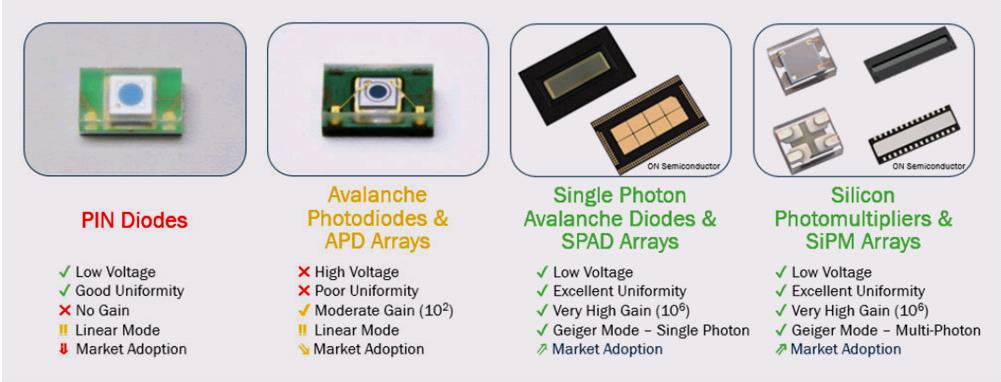 通過(guò)對(duì)比可以看到,PIN二極管、APD陣列、SPAD陣列、SiPM陣列還是有很大不同。