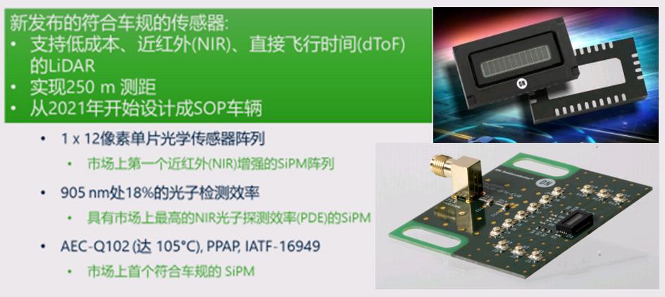 SiPM和SPAD(單光子雪崩二極管)探測(cè)器是2018年收購(gòu)SensL所得。SiPM是一種建立在SPAD上的探測(cè)器,對(duì)單個(gè)光子非常敏感,能夠在陽(yáng)光直射環(huán)境條件下工作,有助于系統(tǒng)探測(cè)到最遠(yuǎn)的物體,即使反射率最小?;赟PAD陣列的飛行時(shí)間圖像傳感器可以實(shí)現(xiàn)高分辨率4D成像,從場(chǎng)景中的所有點(diǎn)同時(shí)捕獲深度數(shù)據(jù)和強(qiáng)度。