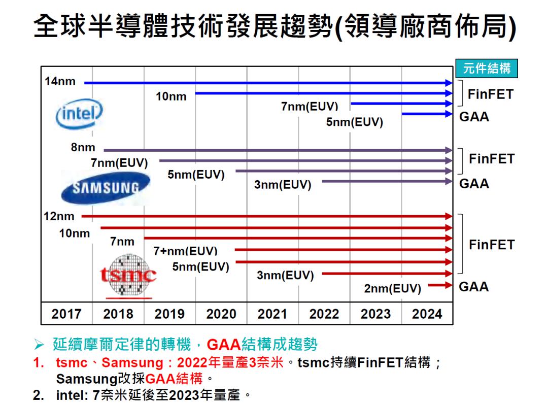 在28納米之后,平面晶體管工藝達(dá)到極限,F(xiàn)inFET(鰭式晶體管)延續(xù)了摩爾定律,將工藝節(jié)點(diǎn)推進(jìn)到現(xiàn)在的10納米以下。不過FinFET路線也已經(jīng)接近極限,三星將在3納米工藝上率先采用GAA(全環(huán)繞柵極)結(jié)構(gòu),臺積電則在3納米節(jié)點(diǎn)繼續(xù)FinFET結(jié)構(gòu),到2納米節(jié)點(diǎn)再采用GAA結(jié)構(gòu)。臺灣工研院認(rèn)為,英特爾在晶圓制造上遇到了麻煩,7納米工藝(注:三家對工藝尺寸定義各有區(qū)別,不適合直接拿數(shù)字對比)或?qū)⒀又?023年才能量產(chǎn),預(yù)計(jì)英特爾在5納米節(jié)點(diǎn)也將改為GAA架構(gòu)。