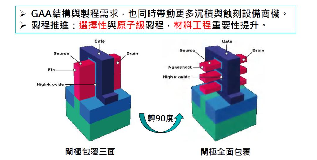 由于新的結(jié)構(gòu)所需的生產(chǎn)工藝與鰭式晶體管相似,關(guān)鍵工藝步驟幾乎一樣,可以繼續(xù)使用現(xiàn)有的設(shè)備以及技術(shù)成果,對臺積電和三星而言,這無疑是代價最低的技術(shù)路線更換方案。但GAA對加工精度要求進(jìn)一步提高,需要區(qū)域選擇性沉積技術(shù)與原子級加工能力,因而材料工程重要性提升,也將帶動更多沉積與蝕刻設(shè)備商機(jī)。
