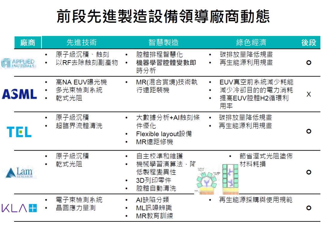 雖然2020年全球超過8成設(shè)備銷往東亞地區(qū),但除了日本,中(大陸加臺灣)韓在設(shè)備業(yè)上影響力都不大。全球前五大半導(dǎo)體前道(即晶圓制造,封裝為后道)設(shè)備廠商應(yīng)用材料(AMAT)、阿斯麥(ASML)、泛林(Lam)、東京電子(TEL)和科磊(KLA)占據(jù)市場份額超過七成,其中只有東京電子總部在東亞,其余都是美歐企業(yè)。