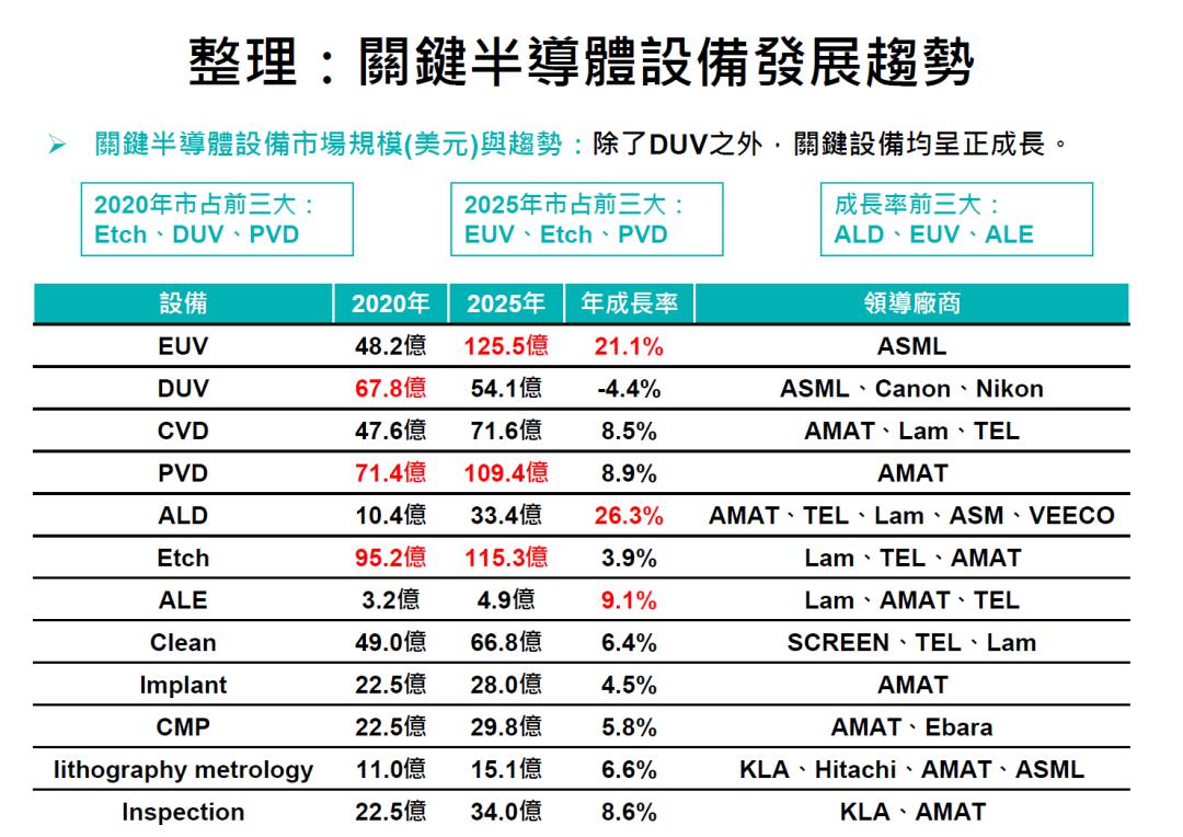 根據(jù)臺灣工研院的估計(jì),全球關(guān)鍵半導(dǎo)體設(shè)備在今后幾年成長勢頭都非常好,除了DUV(深紫外)光刻設(shè)備,其余設(shè)備均呈正增長態(tài)勢。其中ALD(原子層沉積)增長率最高,預(yù)計(jì)2020年至2025年期間,年均增長率達(dá)到26.3%,EUV設(shè)備增長率排名第二,年均增長率也達(dá)兩位數(shù)。而以金額計(jì)EUV設(shè)備則獨(dú)占鰲頭,預(yù)計(jì)2025年EUV設(shè)備銷售額達(dá)到125.5億美元,超過蝕刻機(jī),成為各細(xì)分方向銷售額最高的半導(dǎo)體設(shè)備。