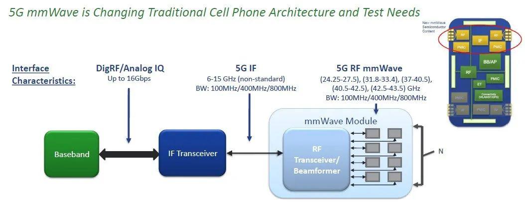 由于采用了毫米波頻段和正交頻分復(fù)用(OFDM)波形,再加上新興的先進(jìn)傳輸方法,使得5G新無線(NR)的空中接口不但與以往幾代的移動(dòng)通信完全不同,也使得毫米波芯片結(jié)構(gòu)更加復(fù)雜,涵蓋基帶、DAC/ADC、IF、波束成形、不同的射頻前端、天線等多個(gè)復(fù)雜組件。數(shù)據(jù)顯示,2020年之后,5G手機(jī)上僅與毫米波相關(guān)的IC數(shù)量就達(dá)到了9-15顆,而為了支持10Gbps的數(shù)據(jù)傳輸速率,手機(jī)中還增加了貼片天線陣列。因此,對(duì)測(cè)試工程師來說,他們面對(duì)的挑戰(zhàn)注定非比尋常。