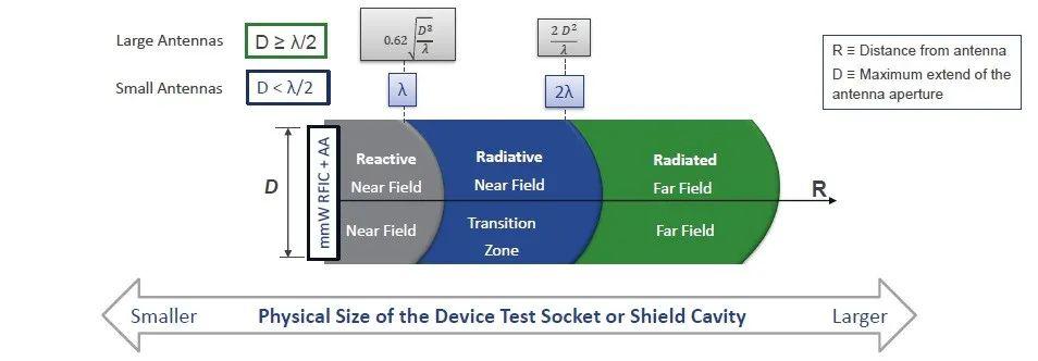 OTA測(cè)試也被稱作“空口測(cè)試”。眾所周知,天線是信號(hào)到自由空間的轉(zhuǎn)換器和接口,大天線封裝孔徑一般大于1/2波長(zhǎng),小天線一般小于1/2波長(zhǎng)。由于電磁場(chǎng)的特性與天線的距離密切相關(guān),所以天線測(cè)試一般又分為近場(chǎng)測(cè)試和遠(yuǎn)場(chǎng)測(cè)試。進(jìn)一步細(xì)分的話,場(chǎng)區(qū)又會(huì)被分為“反應(yīng)區(qū)”和“輻射區(qū)”,反應(yīng)區(qū)里電場(chǎng)和磁場(chǎng)的能量最強(qiáng),電磁波相對(duì)較弱;遠(yuǎn)場(chǎng)基本是真正意義上的電磁波輻射了,輻射形式不會(huì)隨著距離改變,它在大氣中以3億米/秒的速度傳播, 兩者之間被稱之為“過渡區(qū)”。