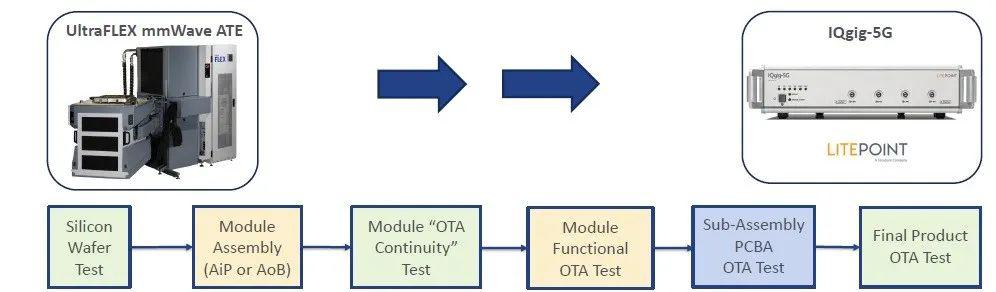 其中,CP測(cè)試、OTA連通測(cè)試和最終成品OTA測(cè)試,是大規(guī)模量產(chǎn)中必須包含的。泰瑞達(dá)的UltraFlex 毫米波板卡和LitePoint IQgig5G在不同的測(cè)試階段可以提供相應(yīng)的毫米波測(cè)試解決方案。