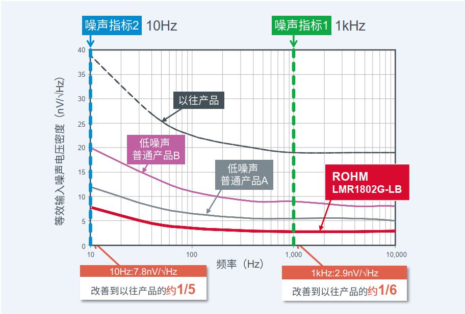 從技術(shù)規(guī)格上看,低噪聲可表述為“等效輸入噪聲電壓”,羅姆推出超低噪聲、低失調(diào)CMOS運算放大器,從工藝層面對集成電路內(nèi)部產(chǎn)生的噪聲進行評估,通過制造工藝、電路設(shè)計改善閃爍噪聲和熱噪聲干擾,實現(xiàn)了10Hz到1kHz頻率范圍的超低噪聲,滿足了低電壓傳感器系統(tǒng)的高精度要求。