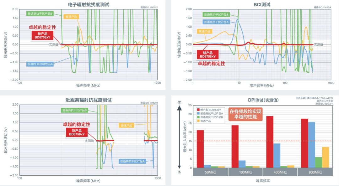 本次發(fā)布的新產(chǎn)品經(jīng)過了電子輻射抗擾度測試、BCI測試、近距離輻射抗擾度測試與DPI測試,并在這四種國際抗擾度評估測試中表現(xiàn)出色。此外,該產(chǎn)品配備了羅姆自有的高精度仿真建模技術(shù),使仿真值與實際值完全一致,完全再現(xiàn)系統(tǒng)特性,防止仿真值與實際值誤差太大導致頻繁返工,也提高了應用產(chǎn)品的開發(fā)效率,節(jié)約了開發(fā)成本。