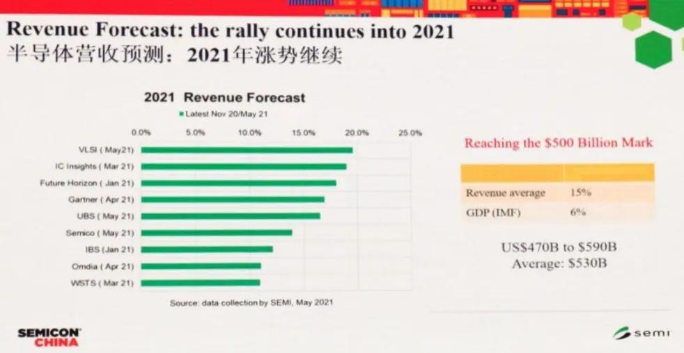 綜合各個(gè)機(jī)構(gòu)的預(yù)測(cè),2021年半導(dǎo)體市場(chǎng)規(guī)?;旧暇褪恰皾q漲漲”。預(yù)計(jì)2021年將會(huì)有15%至20%的增長(zhǎng)率,市場(chǎng)規(guī)模將超過(guò)5000億美元,達(dá)到一個(gè)新的里程碑。
