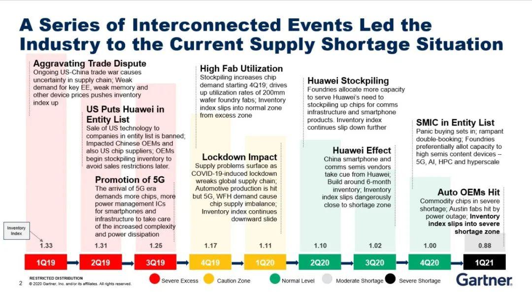 按照正常周期,2020年左右也將從供應(yīng)過(guò)剩走向供需平衡。但中美科技戰(zhàn)和新冠疫情打破了市場(chǎng)正常發(fā)展邏輯,美國(guó)政府對(duì)華為等公司的供應(yīng)限制促使多家設(shè)備廠商擔(dān)心供應(yīng)安全,從而超常規(guī)備貨;而新冠疫情的爆發(fā)又影響到晶圓廠正常生產(chǎn)秩序,部分芯片公司對(duì)行情出現(xiàn)誤判,從而降低產(chǎn)能預(yù)估,讓晶圓廠產(chǎn)能排期更加混亂;進(jìn)入2020年,華為加大備貨力度,以期在9月15日美國(guó)設(shè)限日期前爭(zhēng)取到最大芯片庫(kù)存做緩沖,從而擠占了部分芯片設(shè)計(jì)公司產(chǎn)能;華為供應(yīng)鏈被限制后,其他意圖瓜分華為終端市場(chǎng)的廠商開(kāi)始加強(qiáng)備貨,幾大手機(jī)終端廠商普遍建立了約6個(gè)月的物料庫(kù)存,芯片短缺開(kāi)始在全行業(yè)蔓延;在晶圓代工廠優(yōu)先權(quán)不高的汽車(chē)芯片產(chǎn)能被擠占,汽車(chē)廠商發(fā)現(xiàn)市場(chǎng)需求并未因疫情影響而大幅下滑之后,已經(jīng)拿不到產(chǎn)能,芯片缺貨開(kāi)始導(dǎo)致汽車(chē)廠商停產(chǎn)或限產(chǎn)。