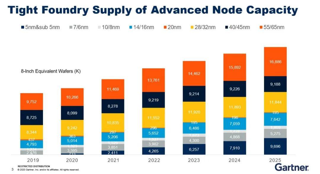 盛陵海認(rèn)為,在多重因素疊加背景下,供應(yīng)緊張至少會(huì)延續(xù)到明年二季度。從當(dāng)前產(chǎn)能供需來(lái)看,5納米及以下工藝產(chǎn)能增速最快,手機(jī)、高性能計(jì)算等對(duì)先進(jìn)工藝的需求極為旺盛;55/65納米工藝也有很大成長(zhǎng)空間,MCU與低端圖像傳感器都采用此種工藝;而28納米與14/16納米也有很好的市場(chǎng)前景。