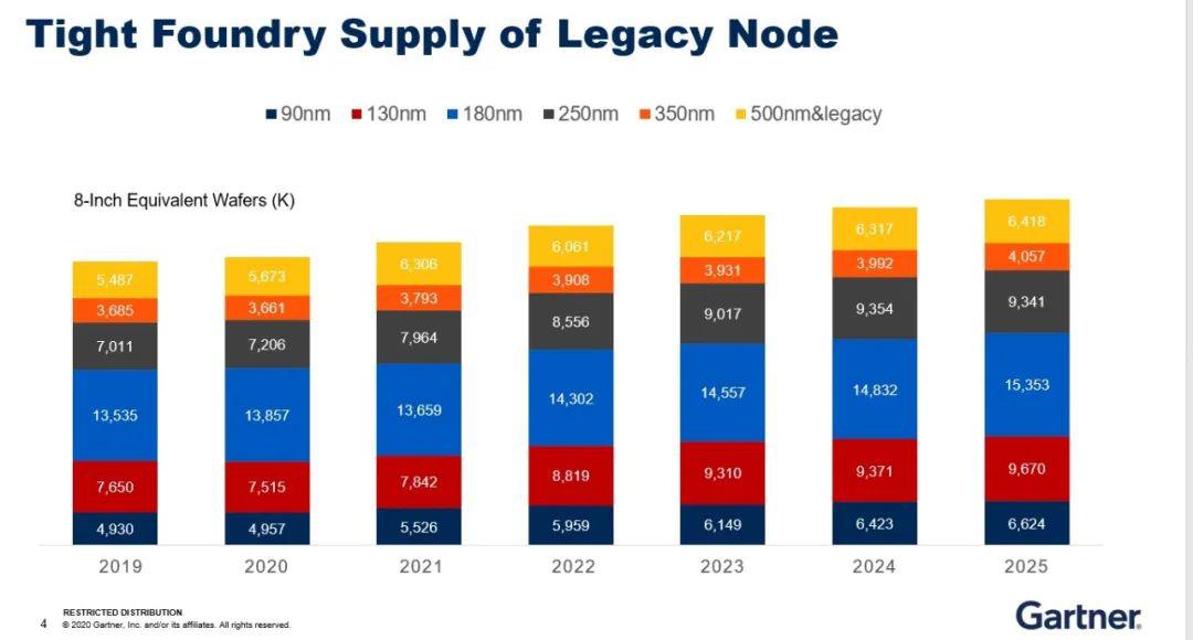 90納米以上的成熟制程的供需失衡則主要是歷史原因累積。在8英寸晶圓制造線建設(shè)高峰期,全球曾經(jīng)有200座8英寸晶圓廠,過(guò)多的產(chǎn)能導(dǎo)致市場(chǎng)出現(xiàn)過(guò)剩,市場(chǎng)上長(zhǎng)期低價(jià)競(jìng)爭(zhēng),部分8英寸晶圓廠由于運(yùn)營(yíng)不善開(kāi)始關(guān)閉,到2016年最低谷時(shí)約有十多家8英寸晶圓廠被關(guān)閉,而且由于設(shè)備廠商全線轉(zhuǎn)向12英寸,晶圓廠想建設(shè)8英寸產(chǎn)能也存在困難。隨著5G與物聯(lián)網(wǎng)應(yīng)用的成熟,市場(chǎng)上對(duì)電源管理芯片(PMIC)、MCU和傳感器需求出現(xiàn)大幅增長(zhǎng),這其中相當(dāng)高的比例采用8英寸成熟制程制造。于是問(wèn)題就來(lái)了,需求日益增長(zhǎng)、產(chǎn)能無(wú)法增加,所以8英寸產(chǎn)能近年來(lái)持續(xù)吃緊。