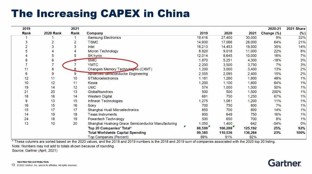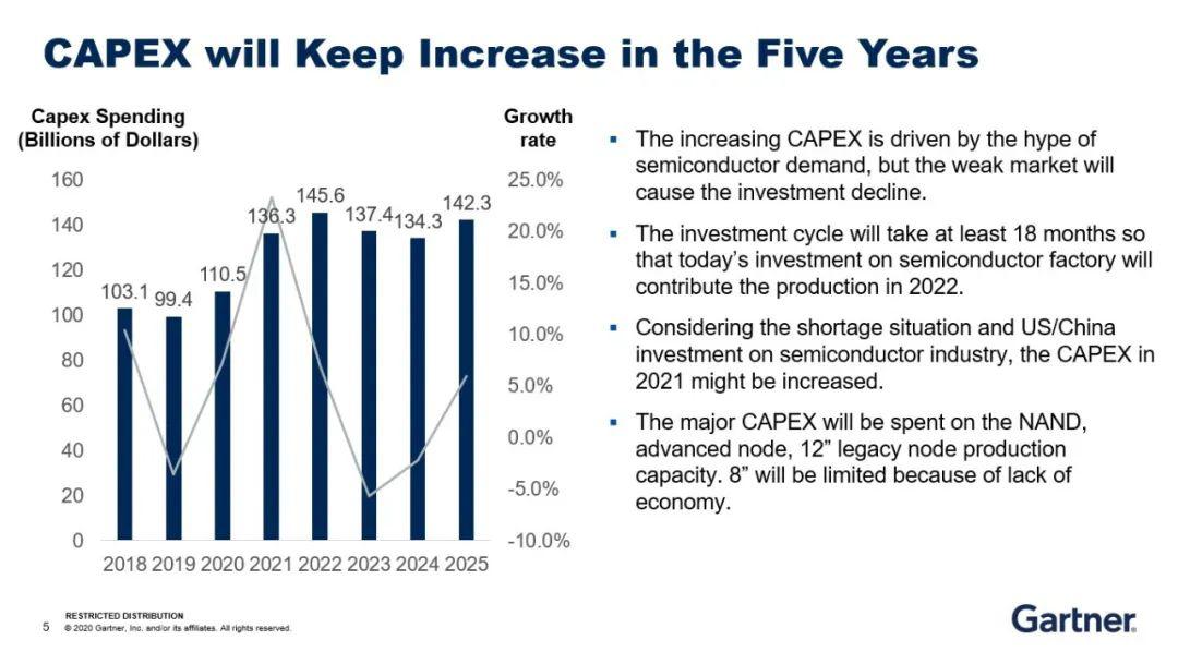 Gartner預(yù)估,2021至2025年全行業(yè)資本支出將一直維持在1300億美元以上的高位,其中大部分將投入到NAND閃存、先進(jìn)工藝制程(5納米及以下)和12英寸成熟制程(90/65納米等)上。