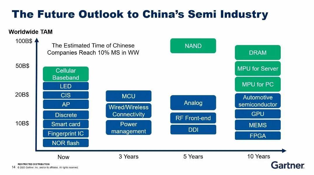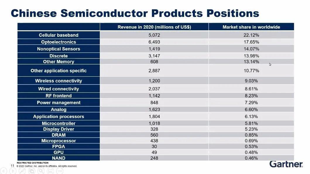 雖說(shuō)中國(guó)半導(dǎo)體增速一直遠(yuǎn)高于國(guó)際平均水平,但起點(diǎn)實(shí)在太低,所以無(wú)力支撐我國(guó)規(guī)模巨大的電子信息制造業(yè)。中國(guó)制造了全球70%的電子設(shè)備,但根據(jù)Gartner的統(tǒng)計(jì),中國(guó)半導(dǎo)體沒(méi)有一個(gè)子項(xiàng)市占率超過(guò)30%。在封裝測(cè)試、光電器件、傳感器和分立器件、晶圓制造上,中國(guó)話語(yǔ)權(quán)相對(duì)較大,市場(chǎng)份額均達(dá)到兩位數(shù)。具體到產(chǎn)品上,手機(jī)基帶芯片全球份額最高,超過(guò)20%,但隨著海思被美國(guó)制裁而無(wú)法繼續(xù)生產(chǎn)芯片,這部分市場(chǎng)份額將被高通等海外廠商吃掉,中國(guó)大陸市場(chǎng)份額恐將掉到10%以下。盛陵海估計(jì),手機(jī)芯片跌破10%以后,在五年內(nèi),將很難再重返10%以上。