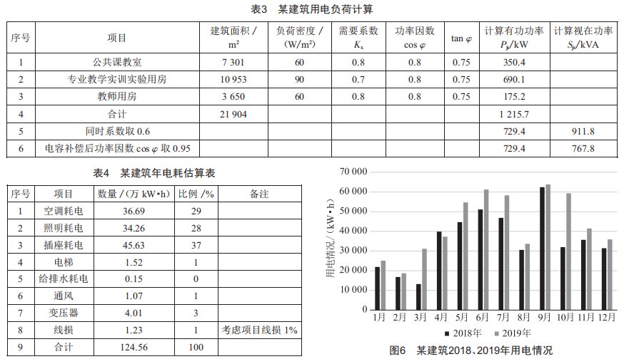 《教育建筑電氣設計規(guī)范》(JGJ310一2013)給出了不設空調的教育建筑的單位面積用電指標,但也是一個范圍較大的指標,需要系數(shù)憑經(jīng)驗取值。在實際設計時,系數(shù)取值往往偏大,以某建筑為例,該建筑的用電負荷情況如表3所示,年電耗估算情況如表4所示,計算視在功率767.8kVA,配置一臺1000kVA的變壓器。