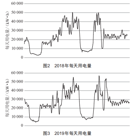 2018、2019年每天用電情況如圖2、圖3所示,每年6月、9月的某些天用電達到高峰。2018年,單日用電峰值有6月20日50400kW·h、9月20日50100kW·h:2019年,單日用電峰值有6月20日55350kW·h、9月17日57000kw·h。另外,從單日用電量也可以看出,寒暑假時用電特別少。