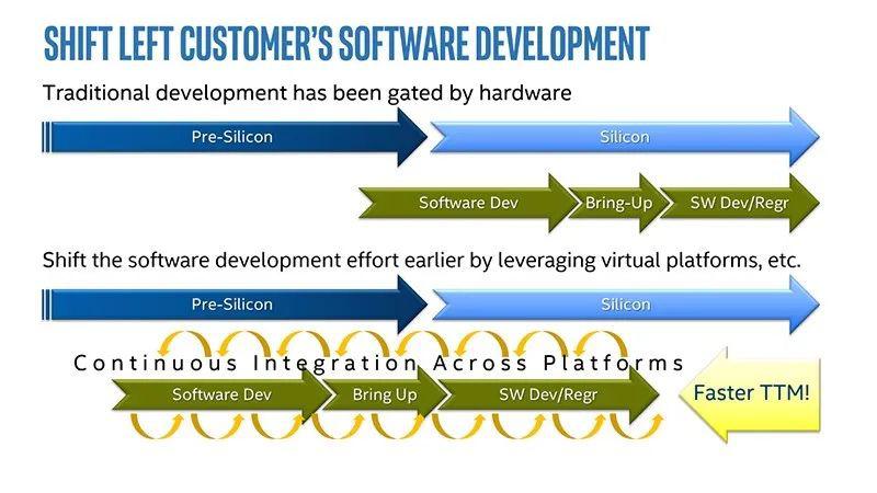 具體來(lái)看,開發(fā)左移(Shift Left)是指提前啟動(dòng)芯片驗(yàn)證和軟件開發(fā)工作。傳統(tǒng)開發(fā)流程各環(huán)節(jié)順序展開,功能驗(yàn)證和軟件開發(fā)只能等芯片生產(chǎn)好之后才能正式開始,隨著芯片集成度提高,芯片驗(yàn)證與軟件開發(fā)工作量越來(lái)越大,投入工程師資源不變時(shí),開發(fā)時(shí)間就大大延長(zhǎng),極大增加了開發(fā)成本和錯(cuò)過(guò)新產(chǎn)品市場(chǎng)最佳投放時(shí)機(jī)的風(fēng)險(xiǎn)。