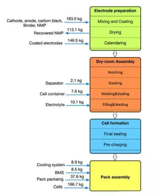 從動(dòng)力電池生產(chǎn)制造過(guò)程來(lái)看,鋰離子電池主要包括電池材料生產(chǎn)、勻漿、涂布、烘干、分切、電芯卷繞、電池裝配、注液和化成等步驟。美國(guó)阿貢實(shí)驗(yàn)室研究結(jié)果顯示,動(dòng)力電池原料獲取和制造過(guò)程總能耗205MJ/kg。據(jù)美國(guó)凱斯西儲(chǔ)大學(xué)的Chris Yuan對(duì)24kWh鋰離子電池組生產(chǎn)能耗分析數(shù)據(jù)顯示,鋰離子單體電池采用錳酸鋰正極和石墨負(fù)極,其中電池材料生產(chǎn)能耗為29.9GJ,電池生產(chǎn)階段能耗為58.7GJ,而電池組裝階段能耗0.3GJ。