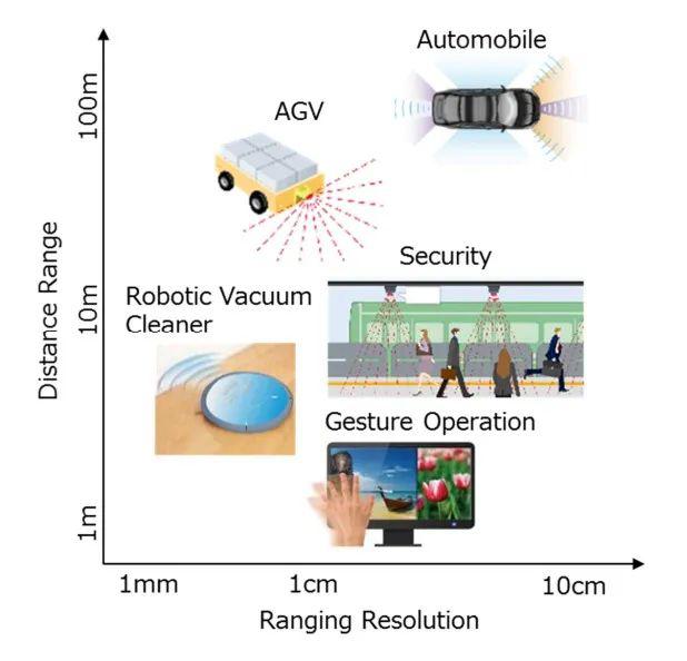 ToF的應(yīng)用包括短距離人臉識別、手勢感應(yīng)等,中長距離應(yīng)用有機(jī)器人導(dǎo)航、避障,包括自動駕駛的激光雷達(dá)等??梢钥闯觯S著測距距離要求越來越遠(yuǎn),對光源功率的要求也越來越高。