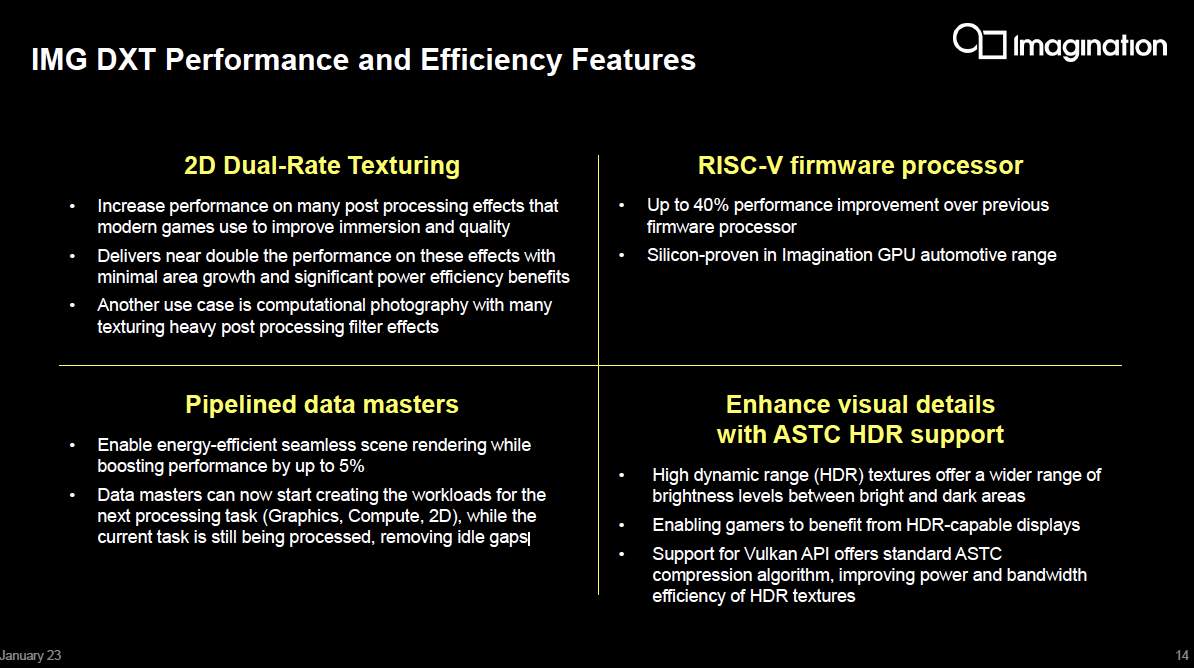 Imagination的全新系列GPU,基本上遵循著一年一代的發(fā)布節(jié)奏,并且每一代都具有特殊的意義。第一代的A系列,奠定了高能效的架構(gòu)的基礎(chǔ);第二代的B系列,則引入了原生可拓展的架構(gòu)特點(diǎn),支持chiplet的設(shè)計(jì)方式;第三代CXT系列則將硬件光追在移動(dòng)端的實(shí)現(xiàn)提供了可能;最新的第四代DXT,進(jìn)一步解決了在移動(dòng)端進(jìn)行大規(guī)模搭載的技術(shù)難題,實(shí)現(xiàn)了光追技術(shù)的可拓展性和更低功耗。