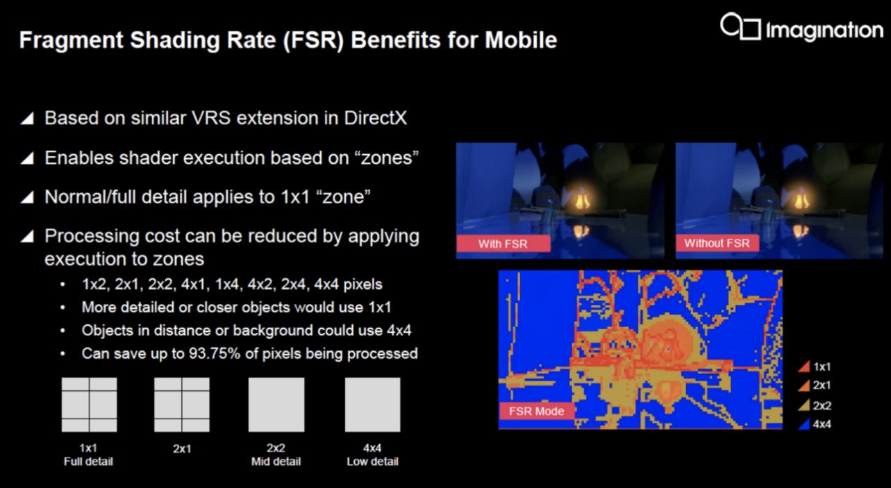 DXT系列的另一大特點(diǎn)在于光追技術(shù)和FSR(Fragment Shading Rate)技術(shù)的結(jié)合,帶來(lái)了更靈活的硬件資源消耗,從而實(shí)現(xiàn)了更低的功耗表現(xiàn)。據(jù)悉,F(xiàn)SR跟VRS效果是一樣的,默認(rèn)直接支持VFSR這項(xiàng)技術(shù),可以讓游戲開(kāi)發(fā)者針對(duì)不同的區(qū)域定義Fragment Shade的執(zhí)行次數(shù)。游戲開(kāi)發(fā)者知道畫(huà)面的哪些背景在后面、哪些場(chǎng)景在前面、哪些場(chǎng)景運(yùn)動(dòng)比較快,可以對(duì)不同的區(qū)域進(jìn)行執(zhí)行的設(shè)定。采用1×1就是傳統(tǒng)的16模塊都運(yùn)行1次,如果是4×4這樣的大塊運(yùn)行1次,可以獲得93%左右的Fragment運(yùn)算能力的節(jié)省。開(kāi)發(fā)者可以自己選擇是需要更好的視覺(jué)效果還是更高效的光追效果,實(shí)現(xiàn)更好的整體效果平衡。