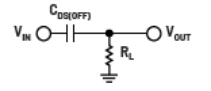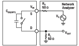 這意味著,隨著信號頻率增加,源極上有更多信號會出現在關斷開關的漏極。如果您觀察開關的等效電路在關斷狀態(tài)下的表現,如圖2中的測試電路所示,會發(fā)現這種狀況不足為奇。當開關處于斷開狀態(tài)時,源極和漏極之間存在寄生電容,即圖中的CDS(OFF)。這種寄生電容使高頻信號能夠通過,關斷隔離圖就是為了確定這些特征。