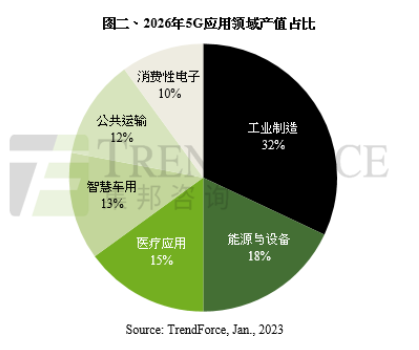 TrendForce集邦咨詢表示,5G應(yīng)用主要?jiǎng)澐譃楣I(yè)制造、能源與設(shè)備、醫(yī)療、智慧車用、公共運(yùn)輸與消費(fèi)性電子產(chǎn)品。以2026年370億產(chǎn)值為依據(jù),其中工業(yè)制造占整體應(yīng)用產(chǎn)值32%為最多,主要運(yùn)用在工廠內(nèi)各制造流程智慧化,并結(jié)合可視化分析應(yīng)用;其次為能源領(lǐng)域18%,用于大規(guī)模智慧電表連網(wǎng)、發(fā)電監(jiān)測(cè)與預(yù)測(cè)式維護(hù)等;醫(yī)療應(yīng)用占15%,專注遠(yuǎn)距診療以提升偏遠(yuǎn)地區(qū)臨床效率;智慧車用及公共運(yùn)輸合計(jì)占產(chǎn)值25%,5G的低延遲特性在智慧車用方面可加速實(shí)現(xiàn)ADAS(先進(jìn)駕駛輔助系統(tǒng)),公共運(yùn)輸則可提供乘客MaaS(交通移動(dòng)服務(wù));消費(fèi)性電子占比10%,主要是替使用者串連各式智慧家電。