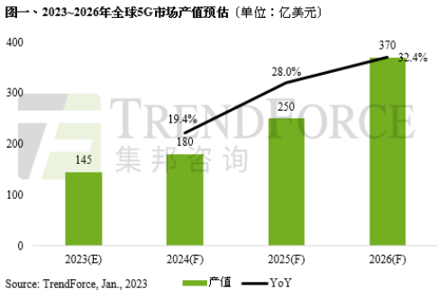 Jan. 18, 2023 ---- 2023年隨著網(wǎng)通設(shè)備如小型基站和5G FWA升級(jí),以及企業(yè)推動(dòng)5G專網(wǎng),TrendForce集邦咨詢預(yù)估2023年5G市場(chǎng)可達(dá)145億美元,至2026年可望上升到370億美元,年復(fù)合成長(zhǎng)率達(dá)到11.0%,期間主要受元宇宙相關(guān)應(yīng)用帶動(dòng),進(jìn)一步刺激5G網(wǎng)絡(luò)需求。